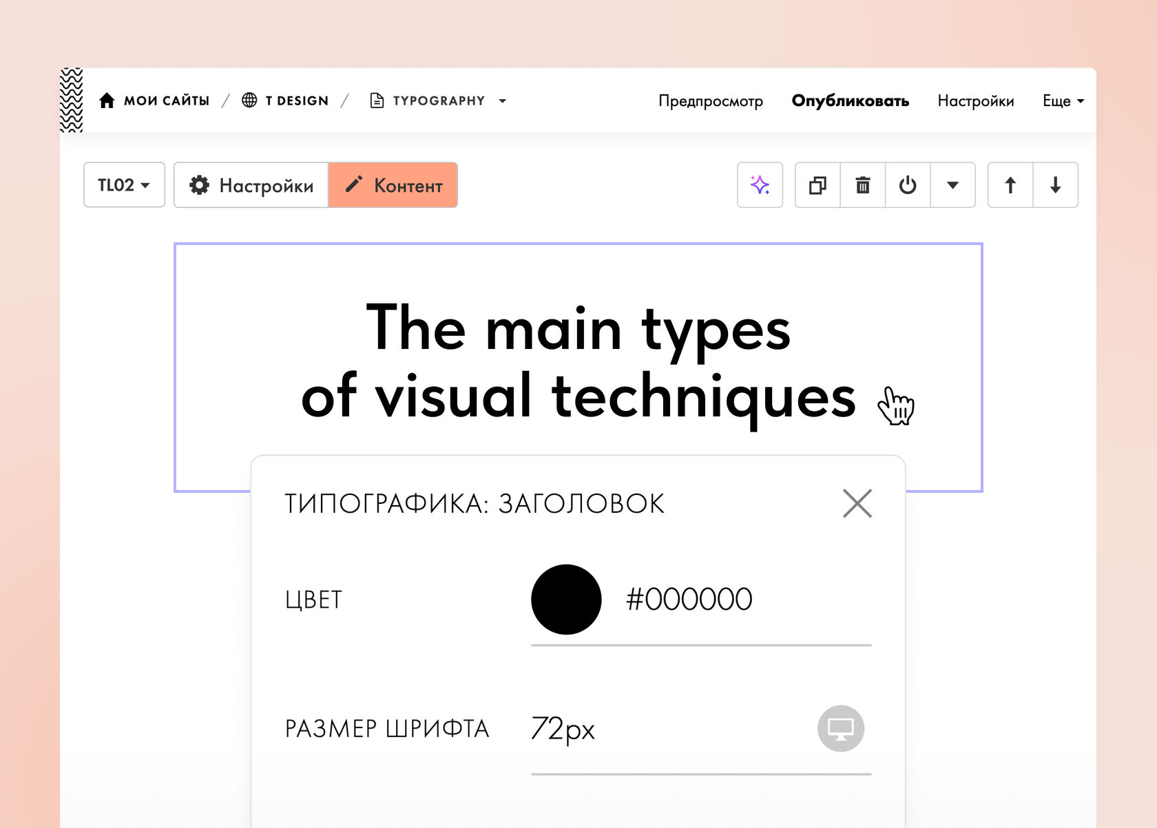 | | | | | Быстрая настройка типографики | | Настраивайте типографику, не заходя в Настройки блока — кликните на текстовый элемент левой кнопкой мыши с зажатым Cmd/Ctrl или откройте контекстное меню, кликнув правой кнопкой на текст → Типографика.
