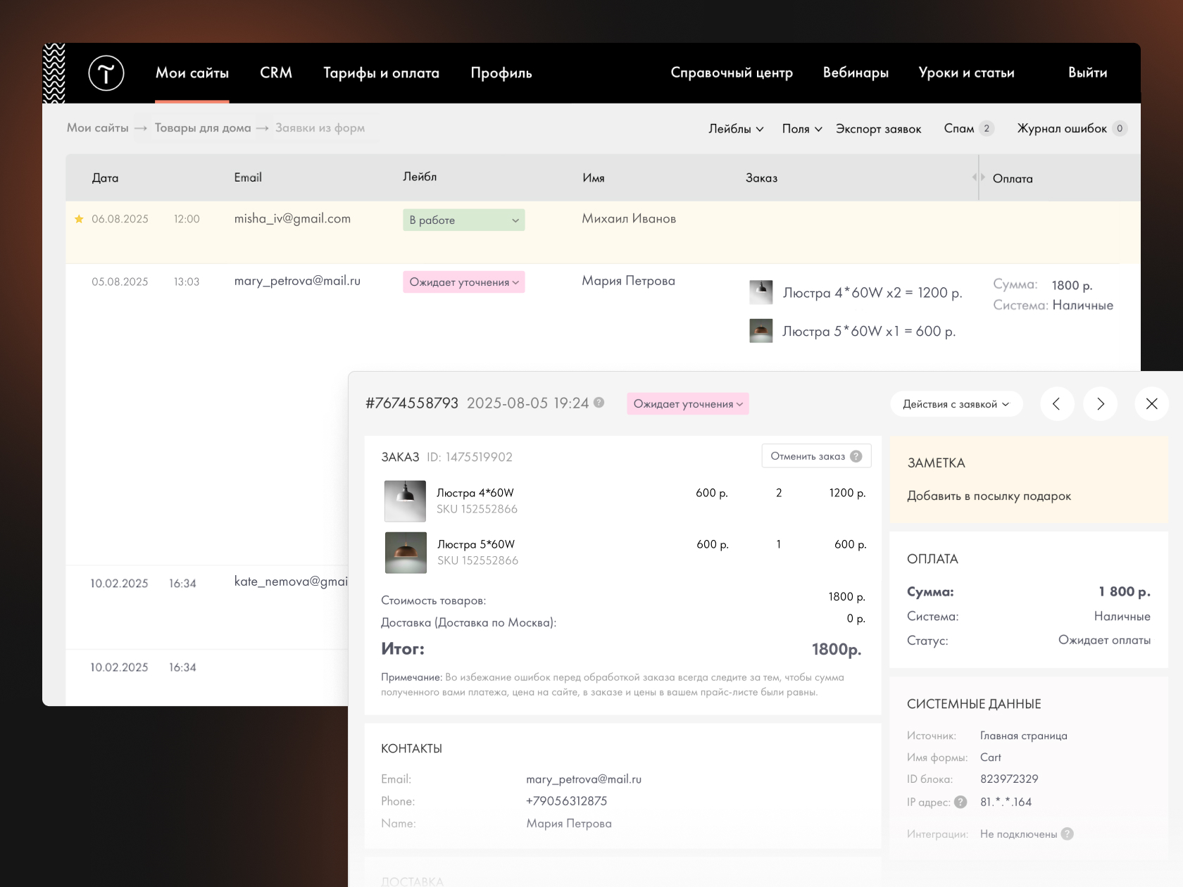 | | | | | Видимые поля в таблице | | Таблицу можно настроить под себя: выбирать, какие поля из заявок отображать, а какие — скрывать. Также вы можете увеличивать или уменьшать ширину колонок и менять их местами. | | | | | | Отметка звёздочкой | | Заявку можно выделить звёздочкой и одним из семи цветов. При этом заявка помечается прочитанной, а вся строка окрасится в выбранный цвет. | | | | | | Добавление лейблов | | Заявке можно добавить лейбл, например «в работе» или «обработано». Они настраиваются самостоятельно — вы задаёте название и цвет. По лейблам также можно отфильтровать заявки. | | | | | | Добавление заметки | | В карточке теперь можно оставить комментарий. Например, написать заметку о хрупкости товара для сотрудника, который будет собирать заказ. | | | | | В Действиях с заявкой появилась новая опция — Распечатать. Вызвать новую функцию можно также через шорткат Cmd/Ctrl+P. | | | | | Статус отправки заявки в подключённые приёмщики | | | | | В заявке теперь отображается подробный статус её отправки в подключённые внешние сервисы и показывается, если произошла ошибка. | | | | | Загрузка видео на сайт | | Теперь на сайт можно загрузить видеофайлы до 5 MB без использования сторонних сервисов. Это пригодится, когда на странице нужно использовать небольшое декоративное видео, например, для видеообложки. Видео можно добавить в базовые блоки из категорий Видео, Обложка, Форма и Галерея, а также в Zero Block.