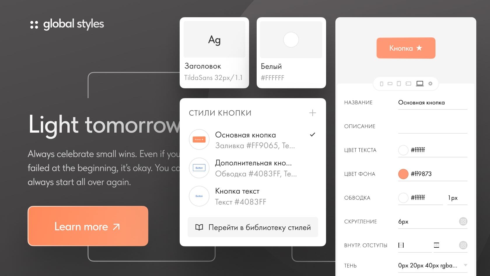 | Глобальные стили, 6 новых блоков, иконка в кнопке и другие обновления | | | | | Глобальные стили — единая система оформления вашего проекта | | Настраивайте в одном месте внешний вид кнопок и текстов, а также цветовую палитру проекта. Применяйте в пару кликов стили к элементам базовых и Zero-блоков; если потребуется обновить оформление, просто поменяйте параметры стиля — изменения на сайте применятся автоматически.