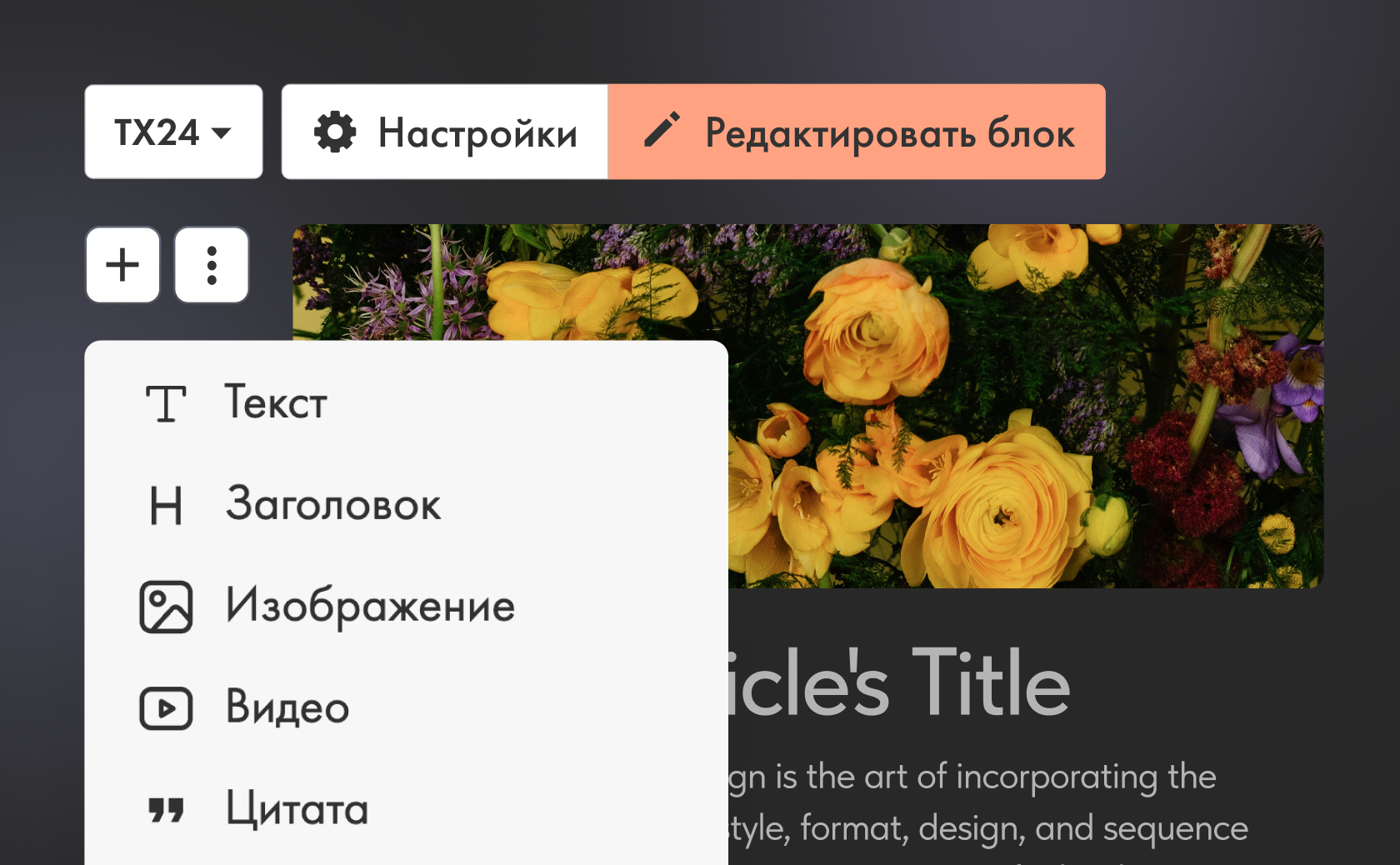 Где настроить: Настройки сайта → Цвета и стили → Управление стилями | | | | | | | | | ME500. Меню интернет-магазина | | Двухуровневое меню со строкой поиска, иконками личного кабинета, избранного и корзины для удобной навигации по интернет-магазину. | | | | | | CR50. Текст и изображение в две колонки | | Блок позволяет настраивать ширину колонок, задавать скругления и отступы для изображения. Он хорошо подойдёт, например, для создания обложки сайта в бенто-стиле. | | | | | | TX24. Статья | | В новом блоке нет привычной кнопки «Контент». Вместо это вы сразу попадёте в режим редактирования, где можно менять контент статьи. Например, добавить заголовок, цитату, разделитель или видео. | | | | | | FR310. Текст и карточки в две колонки | | Блок позволяет гибко настраивать текст и карточки, а также зафиксировать заголовок при скролле. FR310 подойдёт для перечисления преимуществ компании, отзывов о курсе или мероприятии и так далее. | | | | | | TS105. Слайдер с карточками отзывов | | В новом блоке можно выбирать расположение первой карточки. Например, выровнять отзывы по левому краю экрана или по центру. Также можно настроить нужную ширину карточек и задать автоматическую смену слайдов. | | | | | | TX23. Заголовок и текст | | Блок содержит заголовок, описание и основной текст, позволяя не собирать такую структуру из нескольких разных блоков. | | | | | | Иконка в кнопке | | В кнопки теперь можно добавить иконку, настроить её размер и отступы. Чтобы добавить иконку, перейдите в Контент и в поле «Текст кнопки» кликните на «Выбрать иконку». В Zero Block иконка добавляется в поле Icon (Иконка). | | | | | Поиск по заявкам | | В разделе появился поиск, позволяющий искать заявки по ключевым словам. При необходимости можно выбрать конкретные поля, среди которых нужно искать совпадения. | | | | | | Удобный мобильный вид | | Разделом Заявок теперь удобнее пользоваться с мобильных устройств: вместо таблицы заявки отображаются в виде компактных карточек. | | | | | Многослойность теней в Zero Block | | | | В Zero Block теперь можно добавить многослойную тень для элемента. Для каждого слоя можно настроить цвет тени, непрозрачность, смещение, размытие и растяжение. Также появилась возможность добавить на элемент тень, которая будет появляться при наведении (по ховеру).